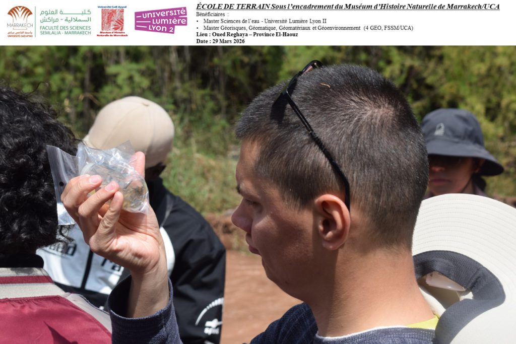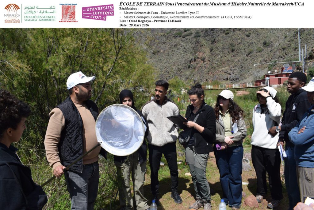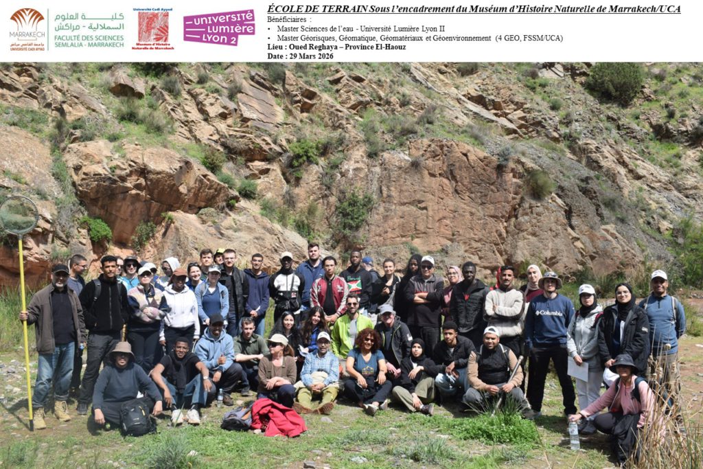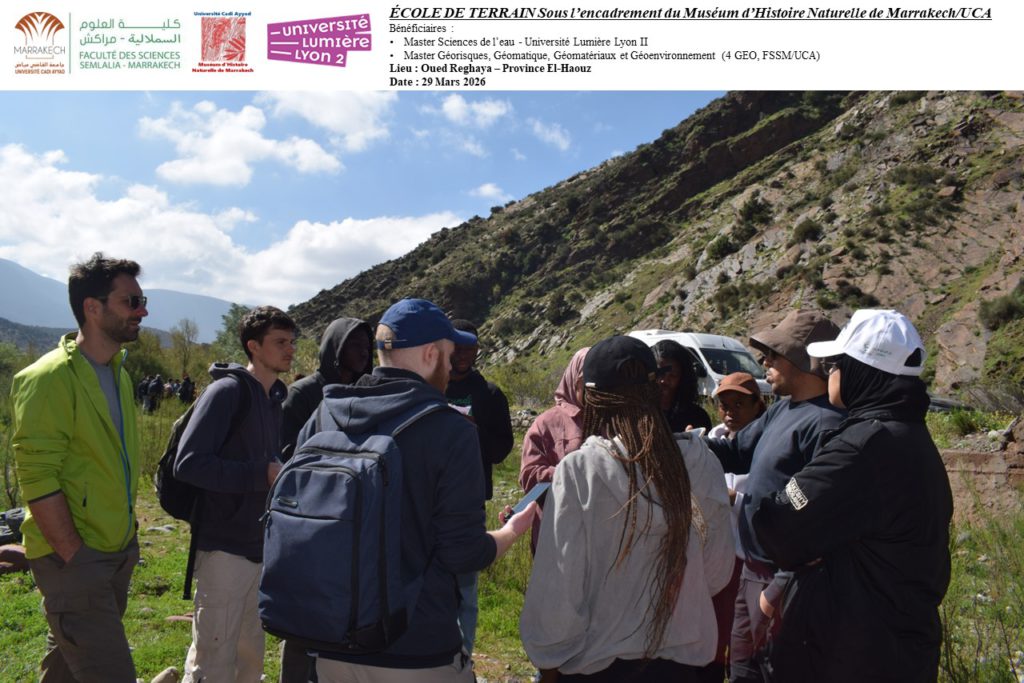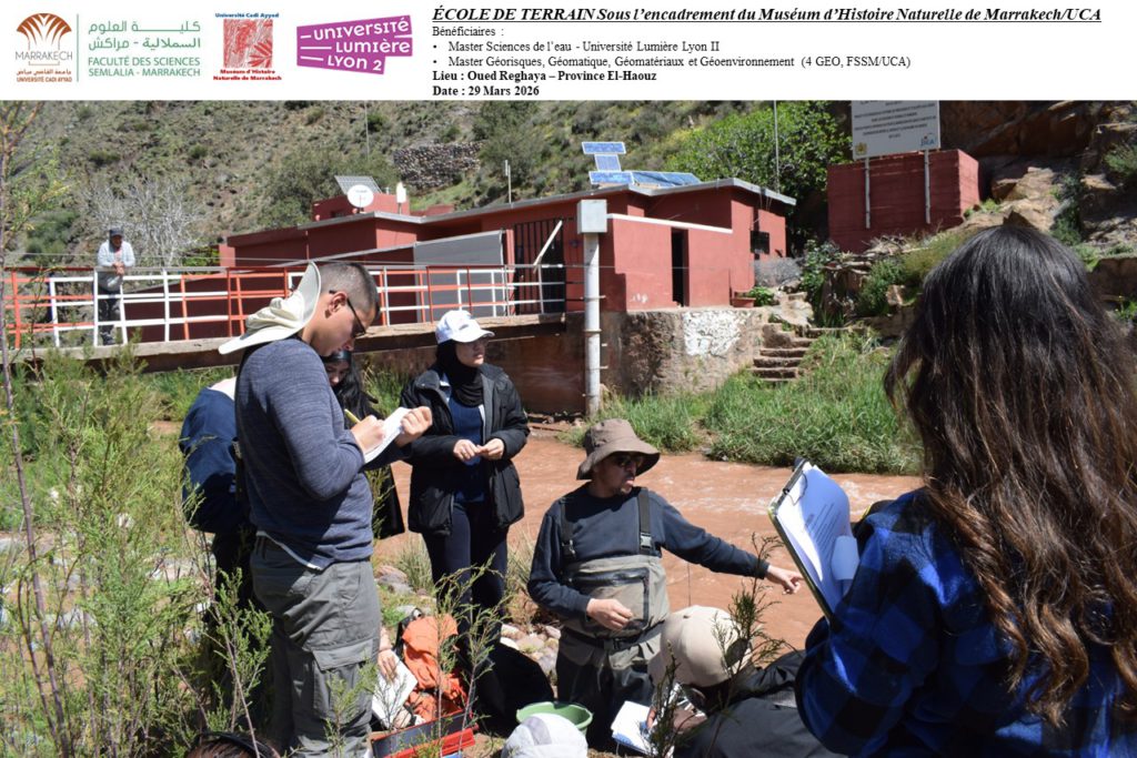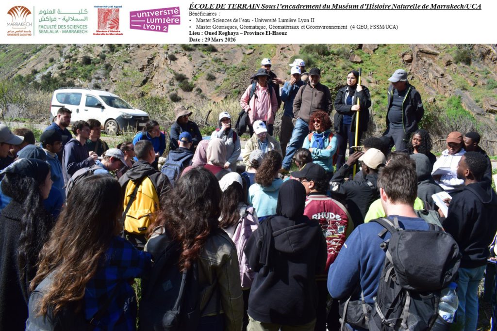 Dans le cadre du partenariat entre le Muséum d’Histoire Naturelle de Marrakech (MHNM/UCA) et l’Université Lumière Lyon 2, une école de terrain unique s’est tenue le 29 mars 2026 au bord de l’Oued Reghaya, dans la province d’El Haouz. Répondant à une demande de l’université lyonnaise pour l’encadrement d’une sortie pédagogique, cette initiative a réuni les étudiants du Master 2 Sciences de l’Eau et du Master Géorisques, Géomatique, Géomatériaux et Géoenvironnement (4 GEO, FSSM/UCA).